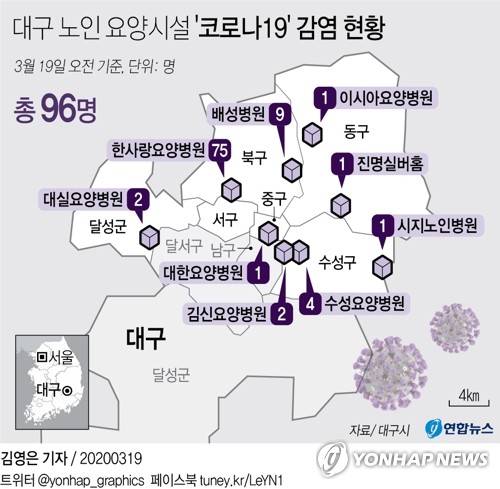 (대구=연합뉴스) 류성무 최수호 기자 = 대구지역 노인요양시설과 종합병원 등에서 신종 코로나바이러스 감염증(코로나19) 확진자가 추가로 속속 확인되고 있다.