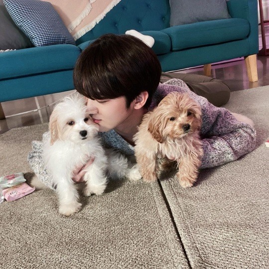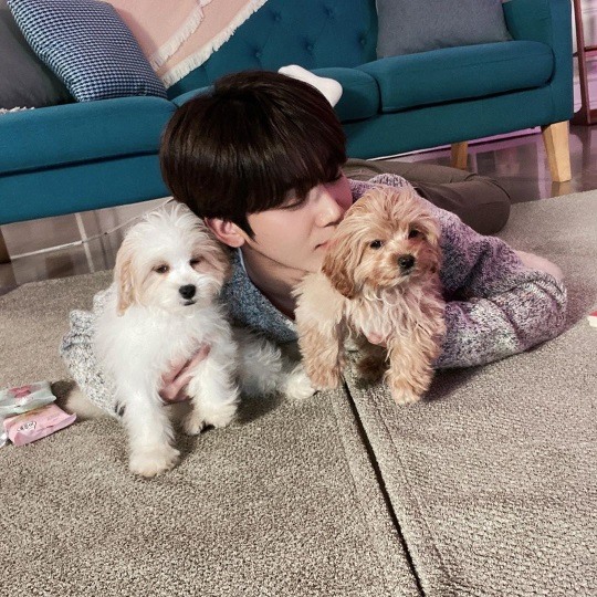 공개된 사진 속 김요한은 강아지 두 마리를 안고 바닥에 엎드려 있는 모습. 그는 강아지에게 뽀뽀를 하며 사랑스러운 분위기를 형성했다.
