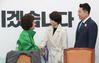 비례연합정당 참여 여부를 놓고 갈등을 빚은 민생당 김정화 공동대표(가운데)와 장정숙 원내대표가 20일 오전 서울 여의도 국회에서 열린 최고위원회의에서 악수하고 있다.(사진=연합뉴스) |