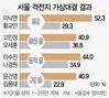 서울경제가 4·15총선을 20여일 앞두고 종로·광진을·동작을·구로을 등 서울의 주요 격전지 네 곳을 선정해 여론조사를 실시한 결과 네 곳 모두에서 더불어민주당 후보의 지지율이 미래통합당 후보의 지지율보다 앞서 있는 것으로 나타났다. 오차범위 내에서 접전을 펼치고 있는 곳은 민주당의 고민정 전 청와대 대변인과 통합당의 오세훈 전 서울시장이 맞붙는 광진을이 유일했다. 이에 따라 문재인 정권 ‘심판론’을 앞세워 19~20대 총선에서 잃은 서울을 다시 탈환하겠다는 통합당의 구상에도 ‘빨간불’이 켜졌다. ★관련기사 6·7면