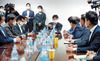 KOVO 임시 이사회 조원태(가운데) 한국배구연맹 총재가 23일 오후 서울 마포구 연맹 사무실에서 열린 임시 이사회에서 13구단 단장과 회의하는 모습. /연합뉴스 |