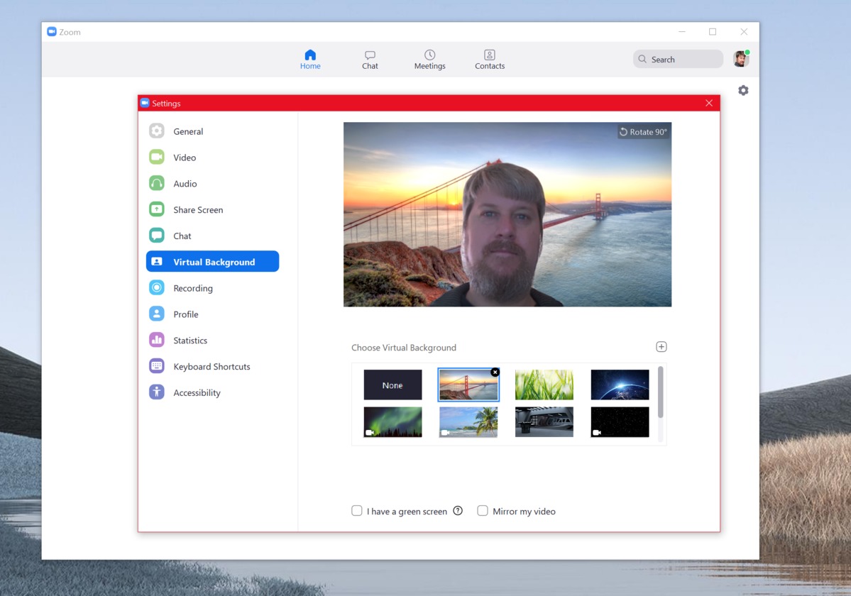 줌은 이 단계를 매우 쉽게 만들었다. 기본적으로 웹캠을 바로 실행해서 사용자가 채팅에서 상대방에게 표시되는 본인의 모습을 볼 수 있다. 영상 아래의 이미지 중 하나를 클릭하면 사용자의 뒷 배경이 정적 이미지(골든 게이트 다리 사진이 인기 있다) 또는 오로라나 해변의 경관처럼 느리게 반복되는 영상 배경으로 대체된다. (예상할 수 있겠지만 영상 파일에는 모서리에 작은 캠코더 아이콘이 있다.)