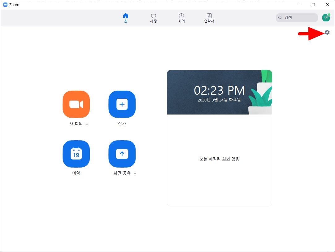 줌의 메인 화면이 열리면 줌의 기본 페이지가 나타난다. 가장 먼저 우측 상단의 줌 설정 아이콘(톱니바퀴 모양)을 클릭한다. 다양한 옵션이 있지만, ‘가상 배경’을 클릭한다.