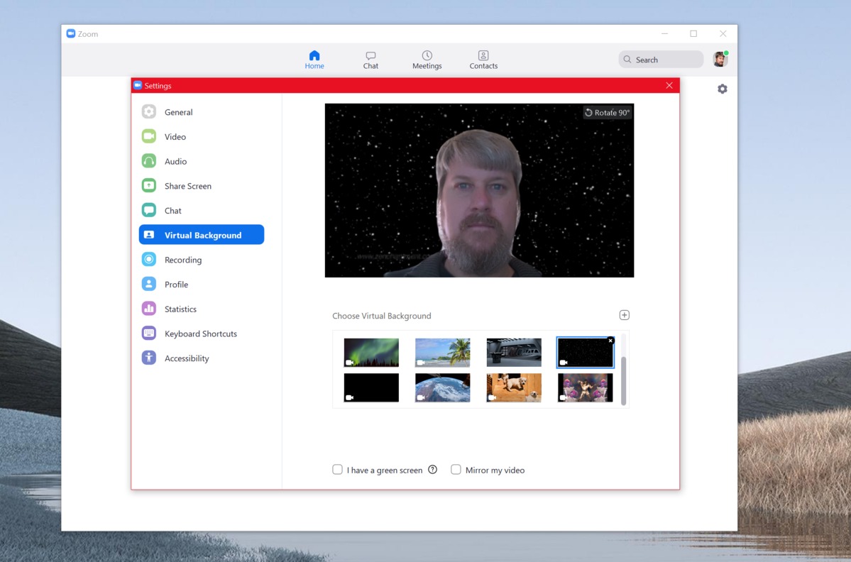 여기까지 중요한 단계는 끝났다. 회의에 연결되어 있지 않더라도 줌 앱을 다시 열고 영상이 원하는 방식으로 보이는지 다시 확인한다. 영상의 배경이 동료를 성가시게 할 수 있으니(설사 의도된 바라고 하더라도) 두 번째 옵션으로 더 차분하고 사무적인 분위기를 준비하는 것이 좋다.