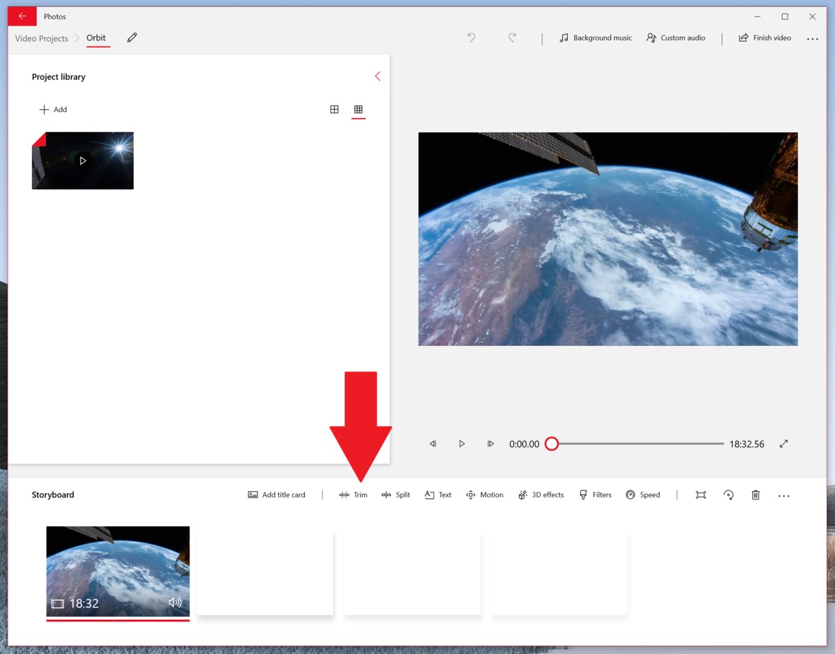 프로젝트 라이브러리에서 ‘추가’ 버튼을 클릭해 원하는 영상 파일을 선택한다. 이 클립은 프로젝트 라이브러리에 나타나는데, 이것을 스토리보드로 끌어내린 다음 첫 번째 상자에 놓는다. 여기에서 여러 효과를 영상에 추가할 수 있지만, 줌의 배경으로 쓰려면 ‘자르기’만 있으면 된다.