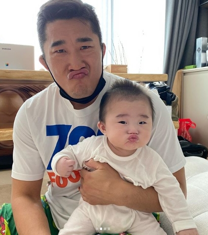 김동현은 25일 자신의 인스타그램에 "가르쳐주지도 않았는데 멍미. 부전자전. 아빠 따라하기"라는 글과 사진을 게재했다.