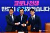 이해찬 더불어민주당 대표(가운데)가 25일 국회를 찾은 민주당 비례연합정당인 더불어시민당 우희종(왼쪽)·최배근 공동대표와 손을 맞잡고 있다. / 이병화 기자 |