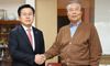 황교안 미래통합당 대표가 26일 오전 김종인 전 더불어민주당 비상대책위원회 대표 자택을 찾아 김종인 전 대표와 악수를 하고 있다. 미래통합당 제공 |