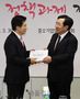 황교안(왼쪽) 미래통합당 대표가 30일 서울 여의도 중소기업중앙회에서 김기문 중소기업중앙회장에게 제21대 총선 중소기업 정책과제를 전달받고 있다./권욱기자 2020.3.30[ⓒ 서울경제, 무단 전재 및 재배포 금지]