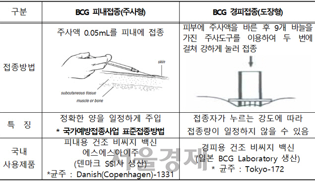 우리나라는 1962년부터 BCG 접종을 실시했는데 40대 이상의 경우 초등학교 6학년 때 단체로 교실에서 공포의 불주사를 맞아야 했다. 이 주사는 간호사가 매번 알콜 램프에 주삿바늘을 소독하며 백신을 놓아 불주사로 불렸다. 문제는 주사 형태로 맞을 경우 맞은 부분이 부풀어 오르며 볼록하게 흉터가 남았다. 독성을 약화시킨 살아있는 병원체를 쓰는 백신(약독화 생백신)이라 몸에서 증식해야 면역반응을 유발하기 때문이다. 불주사는 1988년 서울올림픽 이후 1회용 주사기가 보편화되며 역사 속으로 자취를 감췄다. 그러다가 1993년부터 생후 4주 이내 영아를 대상으로 도장 형태(9개짜리 바늘 2개)로 꾸욱 눌러 예방접종을 하는 도장형으로 바뀌었다. 1997년에는 백신 수입사가 고가의 도장형 판매에 주력하기 위해 주사형을 확 줄이는 꼼수를 부려 논란이 일기도 했다.