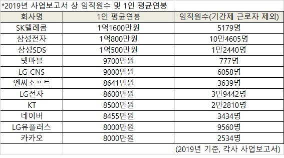 ▶SKT 연봉, 삼성전자 제쳤다=통신·전자·인터넷·게임 등 11개 주요 대기업의 사업보고서(지난해 기준)에 따르면 SK텔레콤 5179명의 임직원 1인당 평균 연봉은 1억1600만원으로 가장 높았다. 지난 2018년 가장 높았던 삼성전자를 제쳤다. 삼성전자 10만4600명(국내 기준) 임직원의 지난해 1인당 평균 연봉은 1억800만원이다. 지난 2018년에는 1억1900만원으로, 주요 IT대기업 가운데 가장 높았다.
