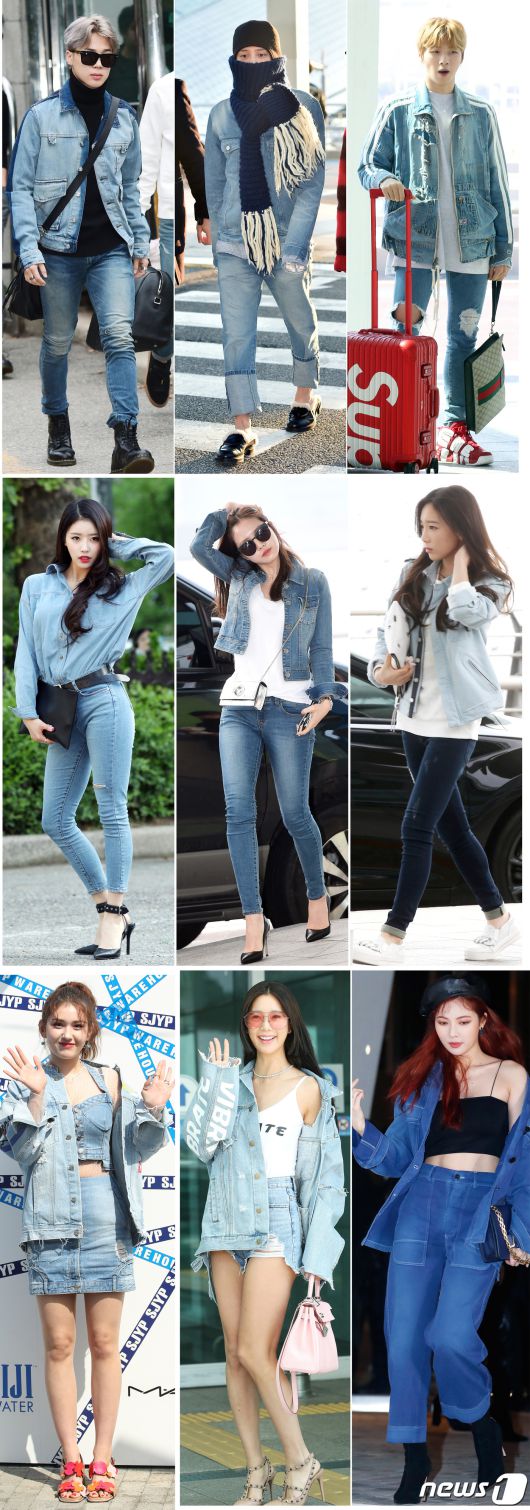 방탄소년단(BTS) 지민은 데님 재킷과 팬츠에 블랙 이너, 선글라스, 워커를 매치해 시크하면서도 멋스러운 청청룩을 완성했다. 빅뱅 지드래곤은 위, 아래 데님 패션에 네이비 톤의 머플러와 블랙 비니를 착용했다. 특히 큼지막하게 롤업해서 입은 청바지에 털 블로퍼를 신어 특유의 센스 넘치는 패션을 선보였다. 여름에 공항에서 만난 강다니엘은 흰 티셔츠에 찢어진 청바지를 입었다. 여기에 장시간 비행을 위해 화이트 라인이 들어간 청재킷을 입어 은근 섹시한 ‘청청’ 패션을 뽐냈다.