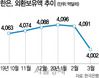 한국은행은 3일 지난달 말 기준 외환보유액이 4,002억1,000만달러로 한 달 전보다 89억6,000만달러 감소했다고 밝혔다. 금융위기가 한창이던 2008년 11월(-117억5,000만달러) 이후 가장 큰 감소 폭이다. 잔액 기준으로도 지난달 외환보유액은 2018년 5월 이후 가장 적은 수준이다.