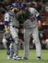 사진=AP/뉴시스 (러셀 마틴이 발 묶인 류현진에게 도움을 손길을 내밀었다. 코로나19로 어려운 상황 속에서 이어지는 선수들의 선행은 주변을 훈훈하게 만들고 있다. 사진은 지난해 경기 도중 이야기를 나누는 류현진과 마틴의 모습.)