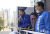 이인영 더불어민주당 원내대표가 7일 오후 서울 강남구 도곡시장 앞에서 열린 김성곤 강남갑 후보와 강남병 김한규 후보의 합동선거 유세현장을 찾아 유권자들에게 지지를 호소하고 있다
