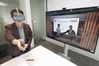 KT Customer전략본부장 박현진 상무는 회의실에서 슈퍼VR을 착용하고 가상형 원격모임 플랫폼 ‘인게이지’를 통해 업무 협약식을 하고 있다. 화면 속 왼쪽 KT Customer전략본부장 박현진 상무, 화면 속 오른쪽 FET 고객전략본부장 티와이 잉(T.Y. Yin) 전무. (사진=KT) |