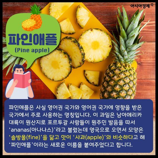 [아시아경제 이진경 기자] 우리가 자주 먹고 봐왔던 과일들의 이름은 어떻게 탄생했는지 누가 지은 것인지 또 어디서 온 이름인지 궁금해 한 적 있나요? 파인애플은 처음부터 파인애플이 아니었으며 코코넛은 특정 동물을 닮아 지어진 이름이라고 하네요. 이처럼 과일마다 숨겨진 유래와 이야기가 무엇인지 한 번 살펴봅시다.