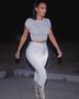 공개된 사진 속에는 킴 카다시안이 밀착티셔츠에 흰색 청바지를 입고 외출한 모습이 담겨 있다. 킴 카다시안의 비현실적 골반 라인이 시선을 사로잡는다.
