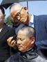 지난해 9월18일 청와대 앞 분수대 광장에서 진행된 자유한국당(미래통합당 전신)의 조국 법무부 장관 사퇴 촉구 ‘릴레이 삭발 투쟁’에 차명진 전 의원이 동참하고 있다. 전날 삭발한 김문수 전 경기도지사가 직접 차 전 의원의 머리카락을 잘라주고 있다. 연합뉴스 |
