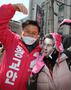 황교안 미래통합당 서울 종로 국회의원 후보가 9일 서울 종로구 교남동 골목에서 거리유세하는 동안 자신의 가면을 쓴 한 지지자와 기념촬영하고 있다./연합뉴스 |