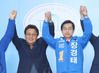 더불어민주당 4·15 총선 공천에서 탈락해 무소속으로 출마한 서울 동대문을 민병두 후보(왼쪽)가 9일 국회 소통관 기자회견장에서 불출마를 선언하고 민주당 장경태 후보를 지지하고 있다. (사진 = 연합뉴스) |