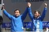 이낙연 더불어민주당 상임공동선대위원장이 13일 오후 충북 제천시 제천역 인근에서 이후삼 민주당 제천시단양군 후보의 손을 잡고 시민들에게 지지를 호소하고 있다. 2020.4.13/사진=뉴스1 |