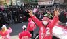 핑크색 차량에 올라 마이크를 잡은 황 대표는 머리에 '경제회복'이라고 쓰인 핑크색 띠를 둘렀다.
