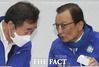더불어민주당 이해찬 대표와 이낙연 공동상임선대위원장이 4·15 총선 공식 선거운동 마지막 날인 14일 오전 국회에서 개최한 민주당·더불어시민당 합동 선거대책위원회에 참석해 이야기를 나누고 있다. /뉴시스 |
