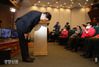 고개숙인 황교안 미래통합당 황교안 대표가 15일 오후 국회도서관 강당에 마련된 개표상황실에서 사퇴를 밝힌 뒤 고개숙여 인사하고 있다. 이준헌 기자 ifwedont@kyunghyang.com |
