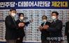 이해찬 더불어민주당 대표와 이인영 원내대표, 우희종 더불어시민당 선대위원장이 15일 국회에 마련된 개표종합상황실에서 당선된 후보자에게 당선 스티커를 붙이고 있다./윤동주 기자 doso7@ |