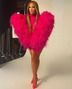공개된 사진 속 제니퍼 로페즈는 퍼 소재로 된 하트 모양 화려한 핑크색 드레스를 입은 채 홍학 같은 모습으로 포즈를 취하고 있다. 운동으로 가꾼 탄탄한 각선미가 시선을 사로잡는다.
