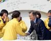 문재인 대통령이 세월호 참사 6주기를 맞은 16일 "다시는 손을 놓치지 않겠다는 마음으로 아이들과 약속한 '안전한 나라'를 되새긴다"고 밝혔다. 사진은 2017년 4월 서울 광화문광장에서 세월호 유가족과 인사하는 모습. /임영무 기자 |