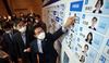 이해찬 더불어민주당 대표와 이인영 원내대표, 우희종 더불어시민당 선대위원장이 15일 국회에 마련된 개표종합상황실에서 당선된 후보자에게 당선 스티커를 붙이고 있다./윤동주 기자 doso7@ |