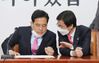 심재철 미래통합당 대표권한대행(왼쪽)이 17일 오전 서울 여의도 국회에서 열린 중앙선거대책위원회 해단식에서 참석자와 대화를 나누고 있다./연합뉴스 |