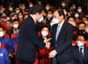 더불어민주당 이해찬, 이낙연 상임공동선대위원이 15일 오후 국회 의원회관에 마련된 당 선거상황실에서 인사하고 있다.(사진=연합뉴스) |