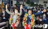 (대전=뉴스1) 김기태 기자 = 박병석 더불어민주당 대전 서구갑 후보가 15일 대전 서구 선거사무소에서 당선 축하 세리머니를 하고 있다. (박병석 선거캠프 제공) 2020.04.16/뉴스1 |
