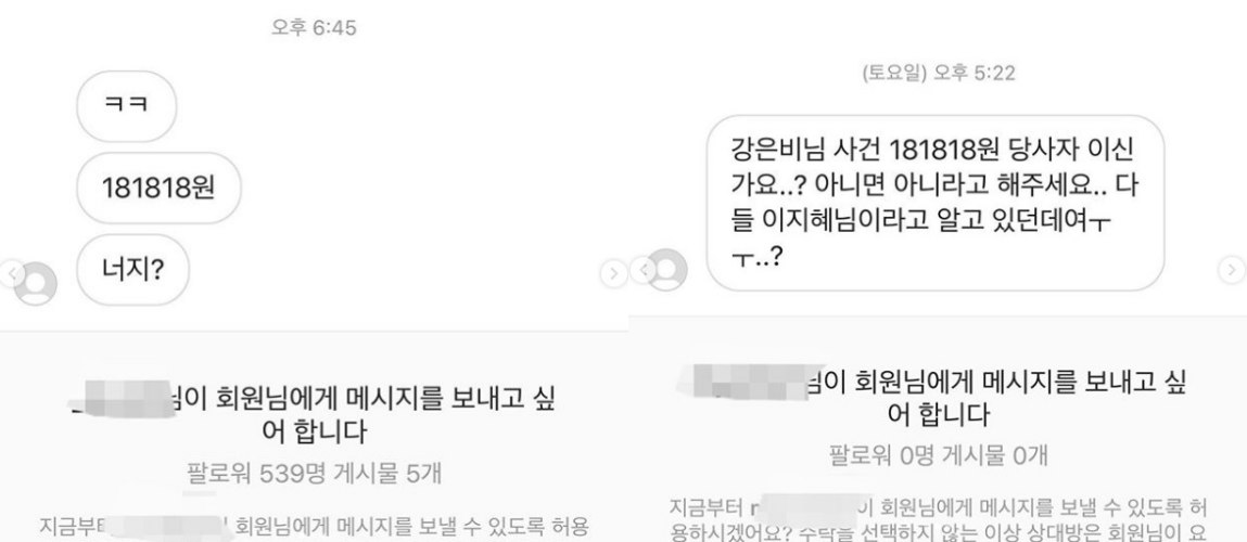 또 이지혜는 자신에게 온 DM(다이렉트 메시지)을 공개하기도. 네티즌들은 이지혜에게 '181818원 너지?', '강은비님 사건 181818원 당사자 이신가요? 아니면 아니라고 해주세요. 다들 이지혜님이라고 알고 있던데요' 등의 메시지를 보내며 이지혜의 해명을 촉구했다.