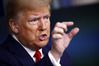 도널드 트럼프 미국 대통령이 18일(현지시간) 백악관 코로나19 대응 태스크포스 브리핑 도중 손동작을 써가며 발언하고 있다.워싱턴 AP 연합뉴스 |