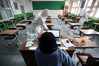 지난 16일 대구시 중구 계성중학교 교실에서 육군 50사단 소속 장병들이 코로나19 확산방지 방역을 하는 가운데 선생님이 온라인 수업을 하고 있다. 연합뉴스 |