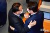 더불어민주당 김부겸 의원이 20일 국회 본회의에 참석하며 이인영 원내대표와 손을 꼭 잡고 있다.