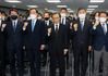 더불어민주당 이해찬, 이낙연 상임선대위원장과 더불어시민당 이종걸, 우희종, 최배근 상임선대 위원장 등이 지난 17일 서울 여의도 당사에서 열린 선거대책위원회 합동 해단식에서 함께 구호 를 외치고 있다. 연합뉴스 |