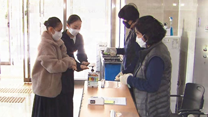 건물 입구에서 체온을 재고 손을 소독한 학생들이 이상이 없다는 표시로 노란 스티커를 받은 뒤 강의실로 들어갑니다.