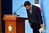 더불어민주당 윤호중 사무총장이 23일 오후 국회 소통관에서 오거돈 부산시장의 성추행 사퇴 파문과 관련 당의 입장을 밝히고 고개를 숙이고 있다. (윤 사무총장은 무관용 원칙에 따라 내일 당 윤리위원회를 열고 오 시장을 제명할 방침이라고 설명했다.)