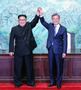 문재인 대통령과 김정은 국무위원장이 2018년 4월 27일 판문점에서 '판문점 선언문'에 서명한 뒤 맞잡은 손을 높이 들고 있다. <사진=한국공동사진기자단> |