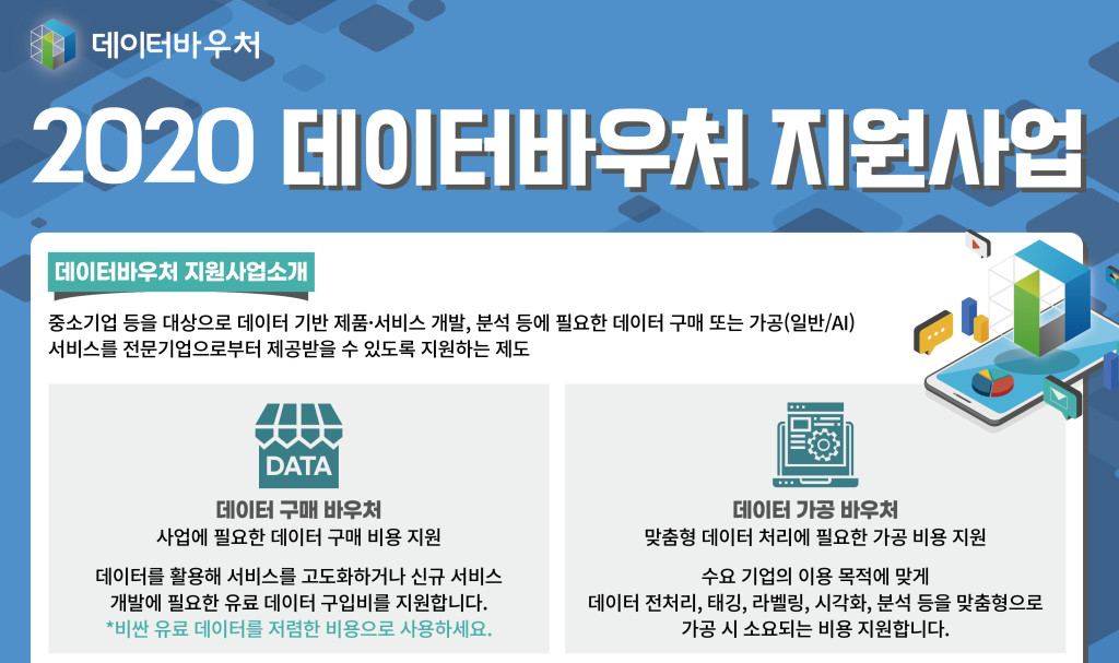 [IT동아 권명관 기자] 한국데이터산업진흥원이 데이터 기반 서비스 개발과 분석 등에 필요한 데이터를 구매하거나, 데이터 전문기업으로부터 가공 서비스를 제공받을 수 있도록 지원하는 '2020년 데이터바우처 지원사업(과학기술정보통신부 주최, 한국데이터산업진흥원 주관)' 참여 업체를 모집한다. 본 사업은 중소기업, 스타트업, 예비창업자 등이 사업에 필요한 데이터 구매 비용이나 가송서비스 비용을 정부가 일부 지원하는 사업으로 올해로 2년째 진행 중이다.