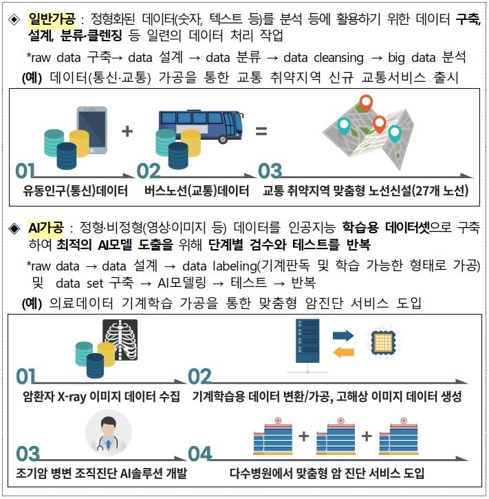 * 데이터 가공 바우처: 인공지능 알고리즘을 적용한 서비스 및 제품 개발, 빅데이터 분석/활용 등에 필요한 데이터 처리 작업에 소요되는 비용을 바우처로 지원.