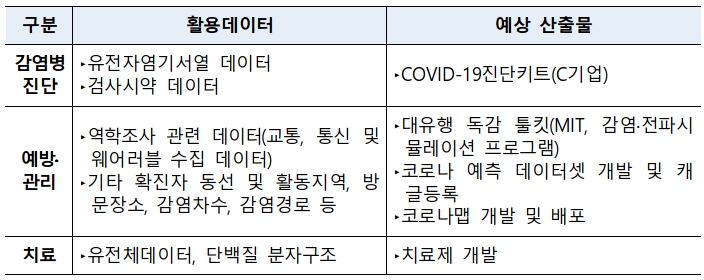 < 감염병 관련 활용 데이터 및 예상 산출물 참고자료, 출처: 한국데이터산업진흥원 >