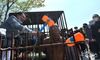 사자(死者) 명예훼손 혐의로 기소된 전두환 씨가 법정에 출석하는 27일 광주 동구 광주지법 앞에서 한 시민이 무릎 꿇은 전두환 동상을 플라스틱 망치로 때리고 있다.