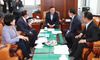 27일 국회 예결위원장실에서 김재원 예결위원장(가운데)과 여야 간사들이 긴급재난지원금 관련 추가경정예산(추경)안 논의를 위해 회동하고 있다. 연합뉴스 |