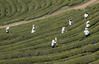 23일 전남 보성군 회천면 일원 차밭에서 보성군청 직원들이 찻잎따기 봉사를 하다가 강한 바람에 밀짚모자가 날아가지 않게 잡고 있다.(사진=연합뉴스) |
